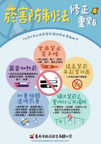 112年3月22日菸害防制修法重點: 1. 全面禁止電子煙,納管加熱菸。 2.加熱菸載具也納管,經健康風險評估審查通過才能販售並禁廣告及供應未滿20歲者。 3. 禁菸年齡提高至20歲。 4.擴大室內外禁菸場所、增加菸品容器警示圖文面積